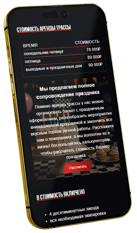 Цель: обновить сайт картинг-центра, сделав его современным, визуально привлекательным и удобным для пользователей, а также повысить эффективность сайта как инструмента привлечения клиентов и записи на заезды и мероприятия.